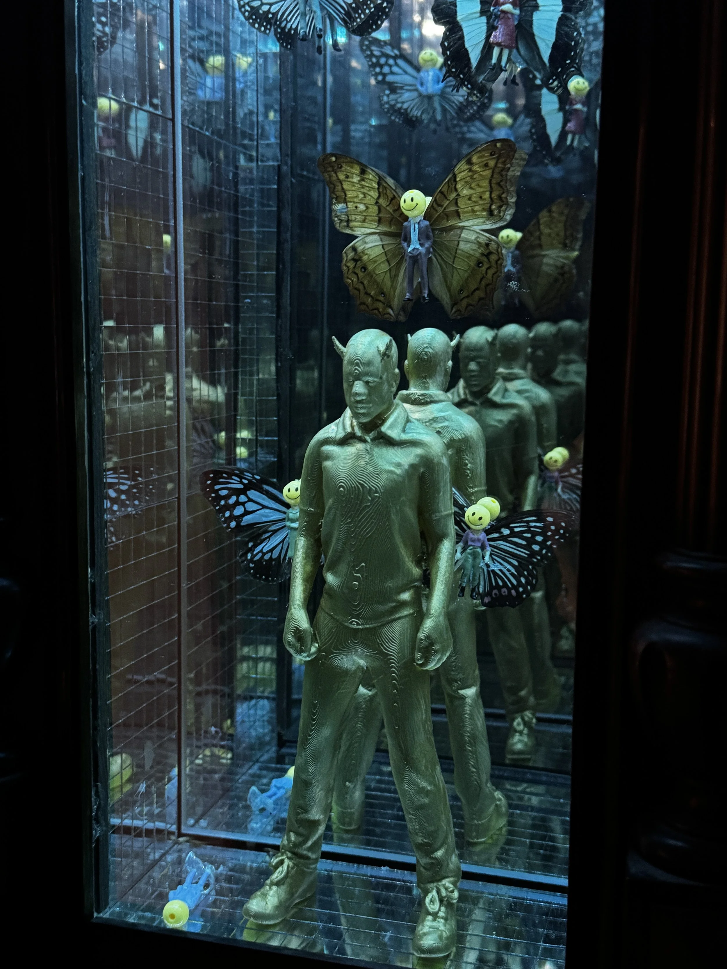 Gold statue of a person with devil horns in a glass case, surrounded by butterflies with smiling faces, and mirrored reflections.