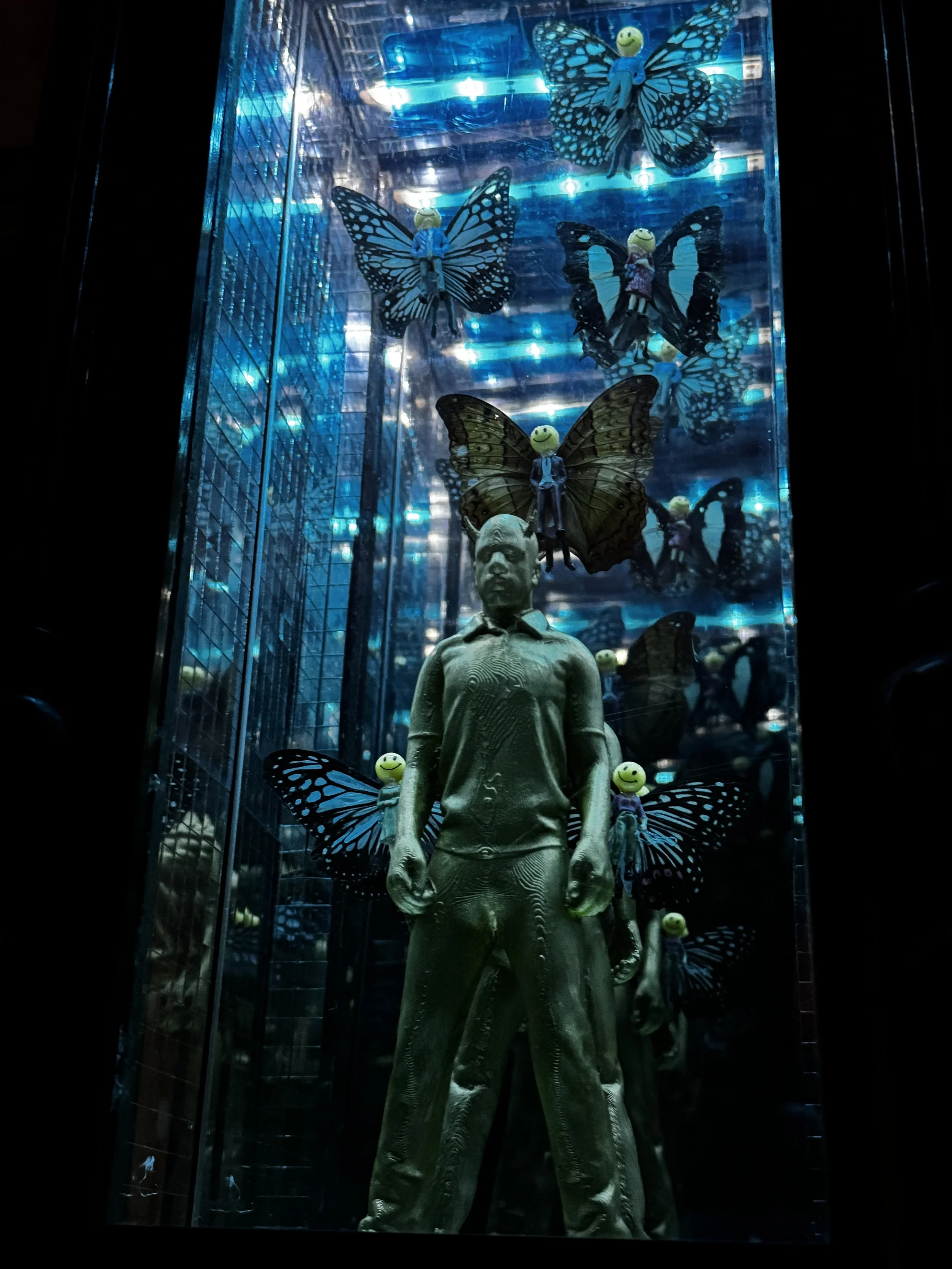 A mirrored display case showing a sculpture of a person with multiple butterflies, each with a smiley face head, in a blue-lit setting.